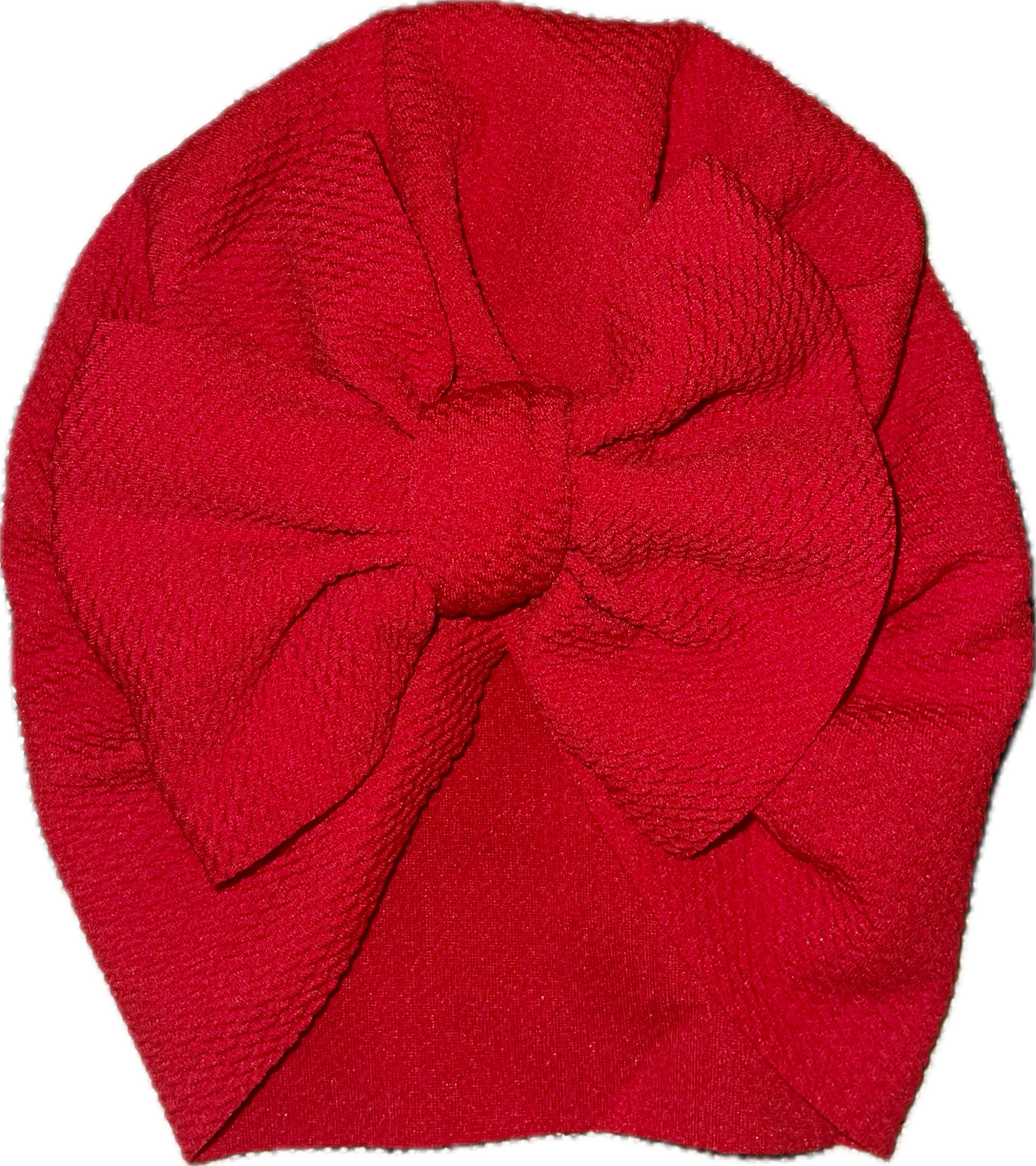 This is an adorable turban that features a bow that will be the perfect fit for your little one's wardrobe. Fabric has good stretch. Fits approximately 6 month up to 18 month (varies with child's head size)